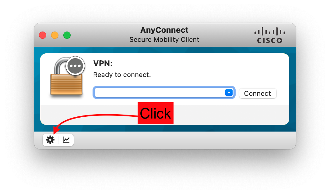 - Once you've opened Cisco AnyConnect Secure Mobility Client, click the gear icon that comes up