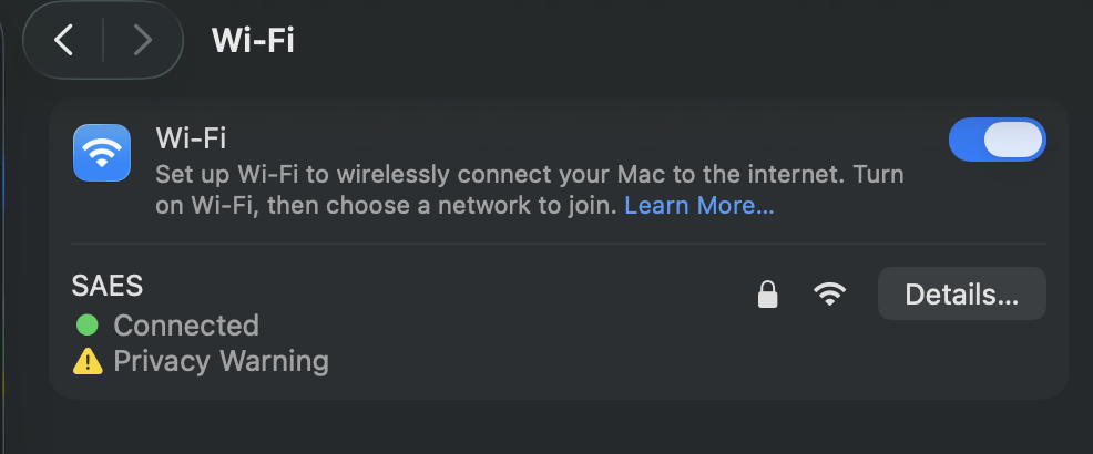 Find your school’s Wi-Fi network (SAES) in the list, then click Details to the right of it.